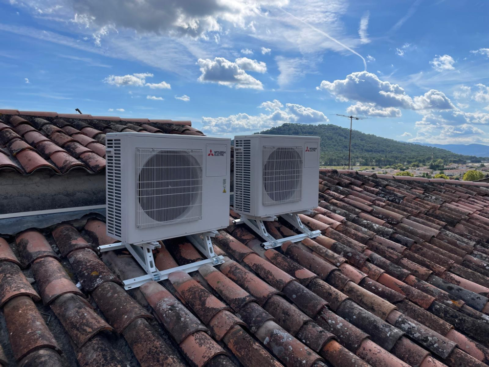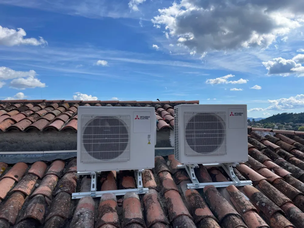 Suite a une demande d'installation sur la commune de Carnoules par des personnes très sympathiques, d'ailleurs je renouvelle mes remerciements pour leur accueil , il s'agissait d'une installation particulière puisque les 2 groupes extérieurs Trisplit de marque MITSUBISHI pour 5 Unitées interieures devaient être installés sur leur toiture Avec des support prévu a cet effet de leur maison de village de 5 niveaux